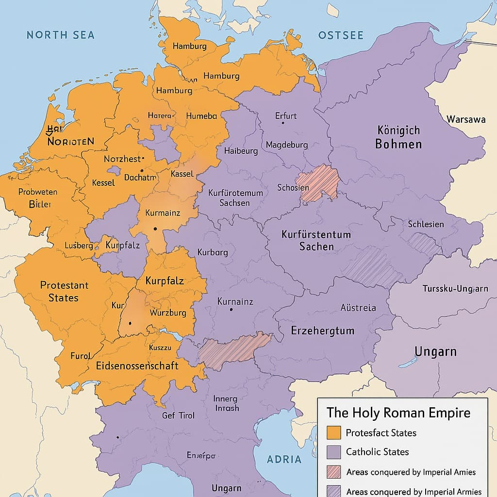 Katolické Španělsko bylo blízkým spojencem rakouských Habsburků a snažilo se udržet svůj vliv v Německu, zatímco Francie (tradičně katolická) se obávala habsburského obklíčení – ze španělských a rakouských držav – a proto byla připravena podpořit protihabsburskou koalici, přestože šlo o spojenectví s protestanty. Svou roli sehrály i ambice severských mocností: Dánsko-Norsko a Švédsko (luteránské státy) sledovaly s obavami posilování Habsburků v severním Německu, které hraničilo s jejich zájmovou sférou. Všechny tyto faktory – náboženské rozpory, mocenské soupeření a regionální konflikty – vytvořily podhoubí, z nějž vzešla třicetiletá válka.